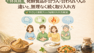 健康の章体質別|発酵食品が合う人・合わない人の違いと、無理なく続く取り入れ方 発酵食品は体に良いと言われますが、体質や体調によって合う・合わないがあります。お腹の張り、下痢・便秘、ほてり、むくみ等のサイン別に、量・種類・タイミングの整え方を解説します。 2026.03.04健康の章